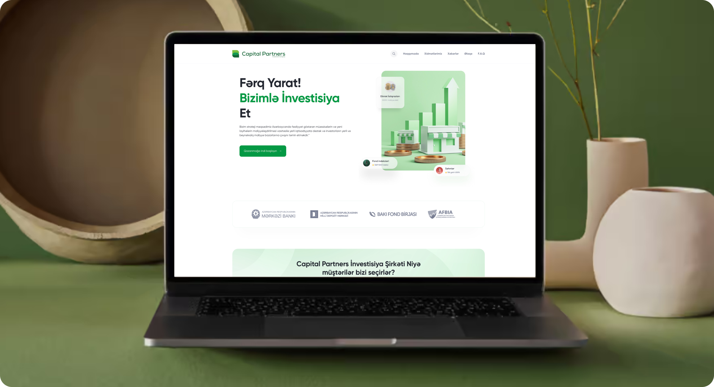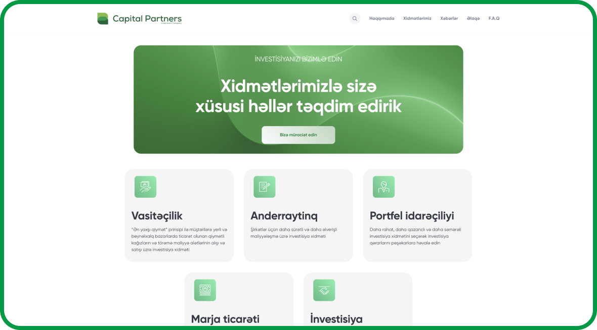 Capital Partners Azərbaycanda fəaliyyət göstərən aparıcı investisiya və konsaltinq şirkətlərindən biridir. Şirkətin rəqəmsal mövcudluğunu gücləndirmək məqsədilə hazırladığımız veb sayt modern dizayn, güclü arxitektur və intuitiv naviqasiya ilə seçilir. Sayt vasitəsilə potensial tərəfdaşlar, investorlar və müştərilər Capital Partners-in təqdim etdiyi xidmətlər və layihələr barədə ətraflı məlumat ala bilirlər.