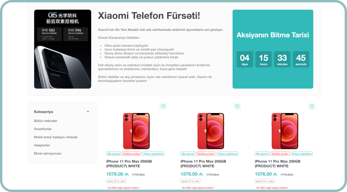 Bu layihədə sürətli yüklənmə, adaptiv dizayn və mobil optimizasiya əsas öncəliyimiz oldu. İstifadəçilər məhsulları rahatlıqla araşdıra, çeşidləyə və səbətə əlavə edə bilirlər. Sadə ödəniş prosesi, müxtəlif filtrasiya imkanları və istifadəçi hesabı modulu satış prosesini daha səmərəli hala gətirir.