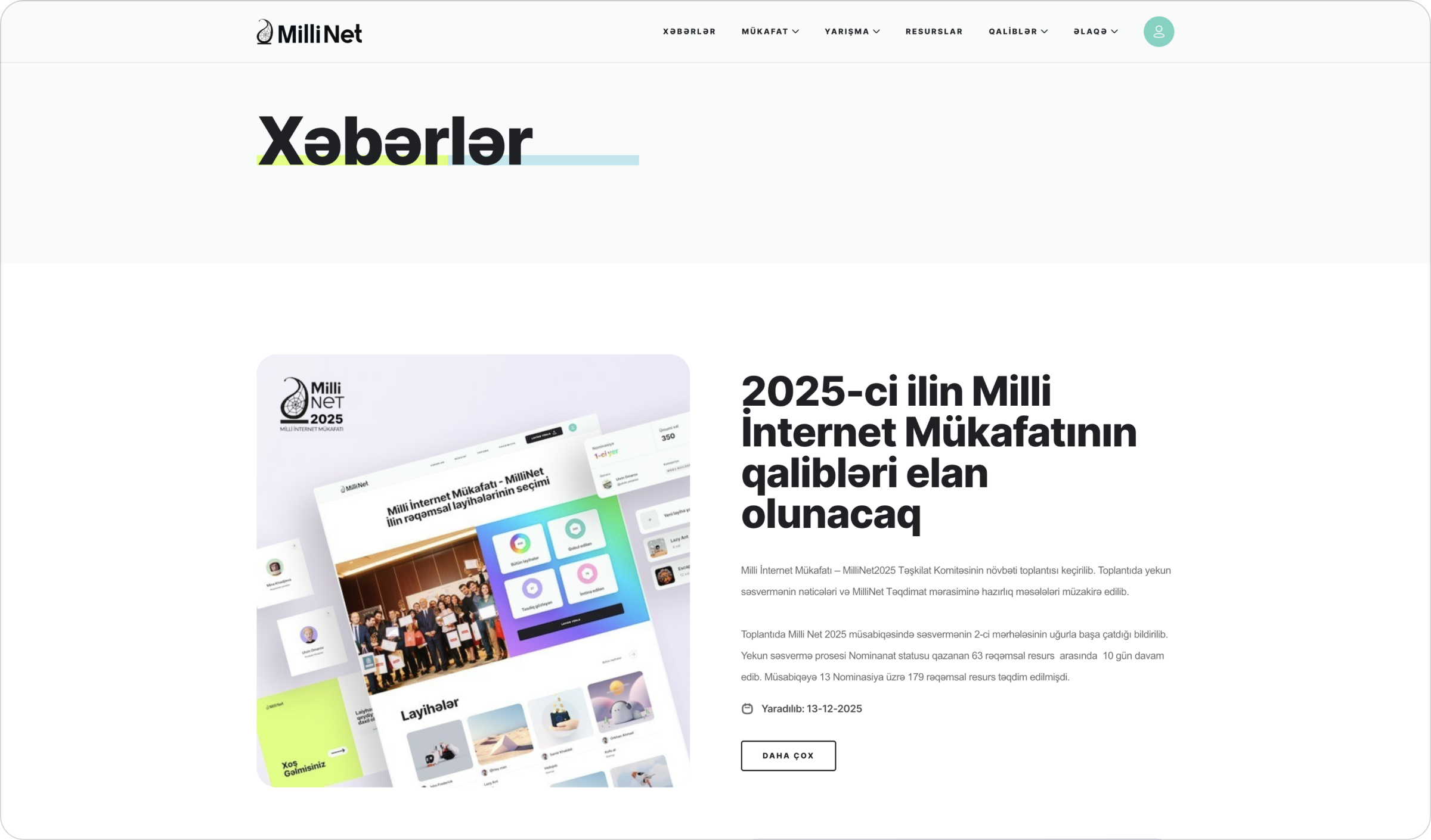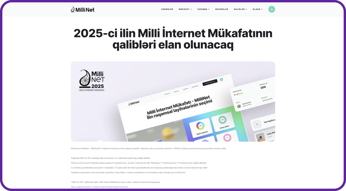 millinet.az vasitəsilə təşkil olunan Milli İnternet Mükafatı ölkədə internet sahəsində peşəkar mükafat geleneğini gücləndirib və ilbəil daha çox rəqəmsal layihəni cəlb edir. Hər il yüzlərlə resurs müsabiqəyə təqdim edilir, müxtəlif nominasiyalar üzrə qiymətləndirilir və seçilmiş layihələr qalib elan olunur.