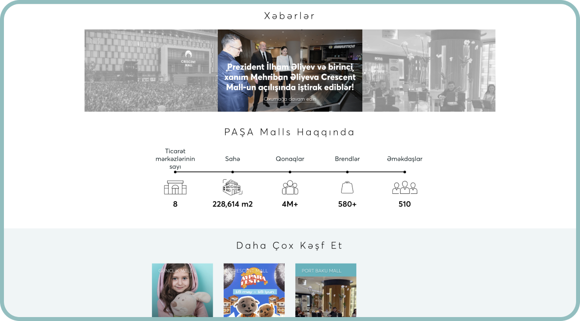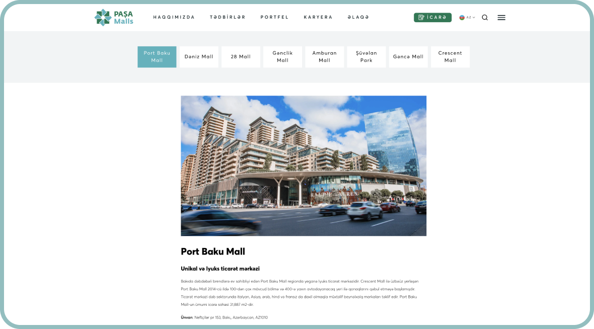 PashaMalls.az — Pasha Malls ticarət mərkəzlərinin rəsmi informasiya və xidmət portalıdır. Bu platforma Azərbaycanda fəaliyyət göstərən Pasha Malls brendinə aid alış‑veriş mərkəzləri, mağaza siyahıları, endirim və kampaniyalar, tədbirlər və ziyarətçi məlumatlarını vahid məkanda toplayır. Sayt müasir dizayn, intuitiv naviqasiya və rahat istifadəçi təcrübəsi ilə fərqlənir ki, bu da ziyarətçilərin tələblərinə çevik cavab verir.